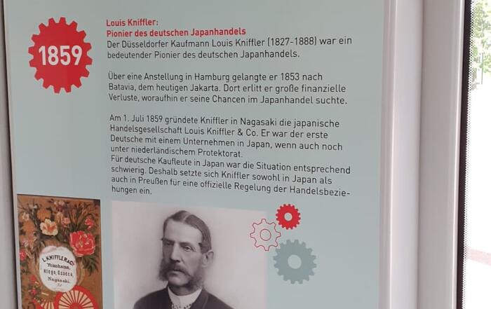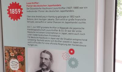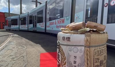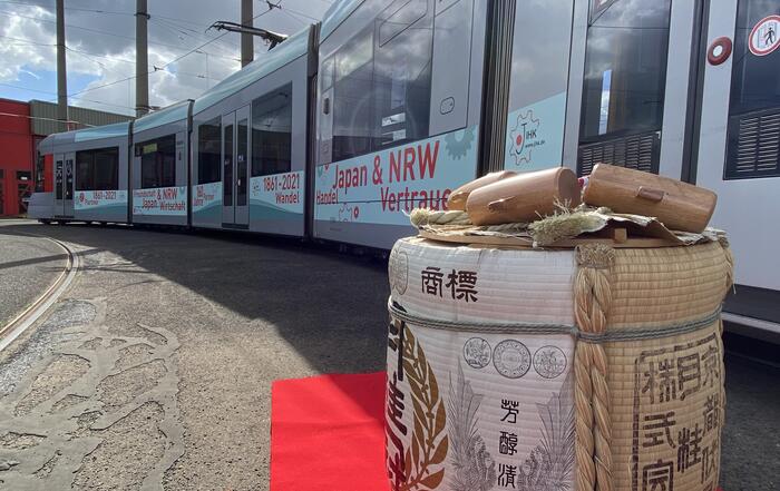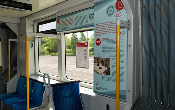日独交流160周年、並びに2021年日本デイズ開催に際し、デュッセルドルフ日本商工会議所は、NRW州と日本との経済関係の歴史について、デュッセルドルフ市内を走るRheinbahn車両内で特別な展示を行いました。